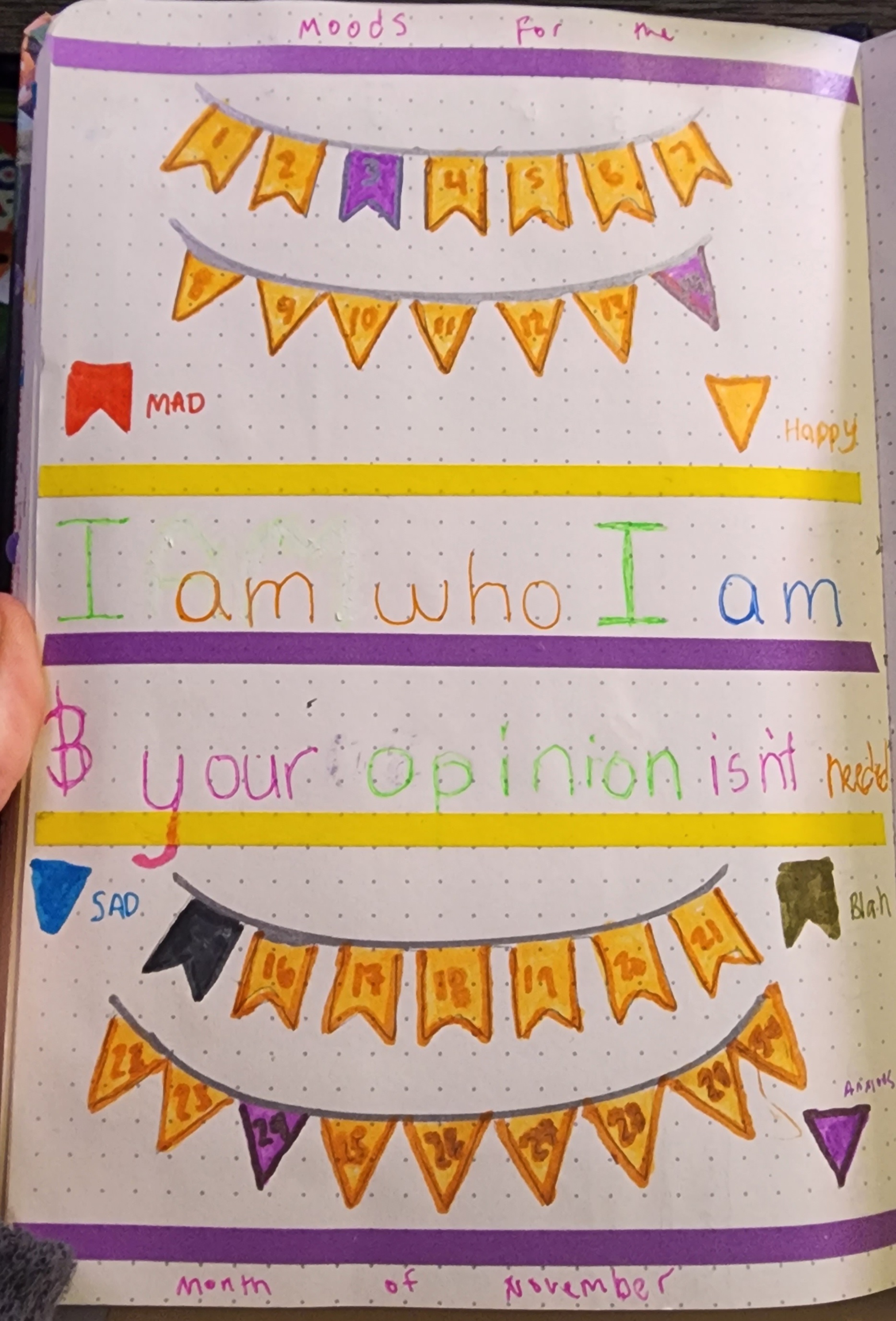 Basic set up of a bullet journal for this therapy activity would be the front page having a picture or quote or drawing that represent who and where you are today.